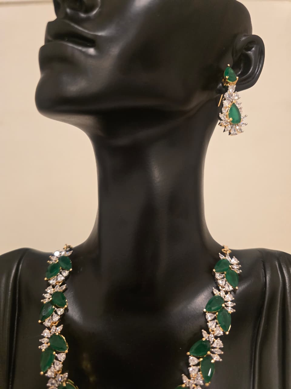 The necklace features rich emerald-green stones arranged in elegant leaf shapes, paired with shimmering crystal clusters that give the piece a premium diamond-like brilliance.