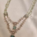 A traditional layered necklace featuring soft green bead strands, emerald-toned stones, and kundan floral motifs. Perfect for weddings, festive occasions, and ethnic celebration wear.