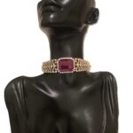 The choker is richly embellished with multiple rows of shimmering crystals that create a high-impact shine. At the center sits a large ruby-toned rectangular stone framed with intricate crystal detailing, making it the highlight of the piece.