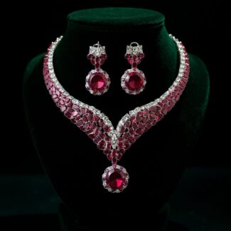 The matching earrings mimic the same crystal-and-ruby design in a sleek geometric silhouette, completing the set with perfect coordination.